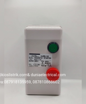 Dol Magnetic Starter HUEB-16K Teco. TECO HUEB-16K adalah starter motor Direct On-Line (DOL) magnetik 3 fase dalam enclosure plastik dengan tombol tekan On/Off terintegrasi. Starter ini berfungsi untuk menghidupkan dan menghentikan motor AC secara langsung pada tegangan penuh sambil menyediakan perlindungan beban berlebih termal bawaan. Magnetic Contactor Teco, Doll Starter.
